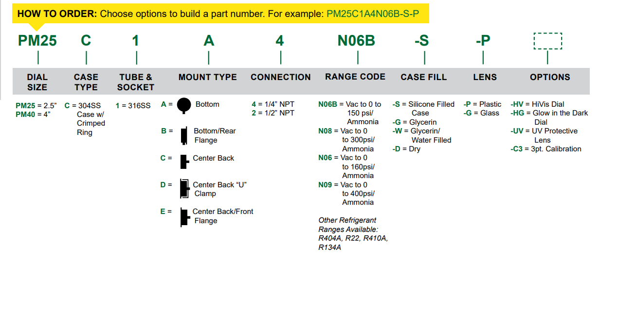 我们的工业用不锈钢制冷压力表有 2.5 英寸和 4 英寸两种度盘尺寸。对于从事供暖、通风、空调等工作的技术人员来说,这些压力表是必不可少的。