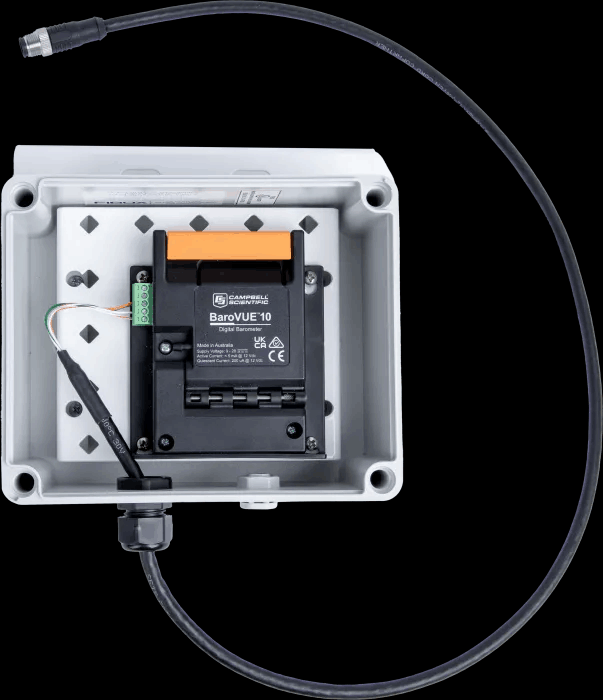BaroVue 10 是一款低功耗数字气压计(-40 至 +60°C),在整个压力和温度范围内具有同类最佳的精度和稳定性(±0.1 hPa/年)。与其他同类产品不同,它可以连续运行,无需电源循环。数字输出为 SDI-12 和 RS-232,与模拟传感器相比,可降低噪声和测量不确定性,并使 BaroVue 10 与所有坎贝尔科学公司的 SDI-12 设备兼容。此外,这种气压传感器可以安装和集成到许多新的和现有的气象站中。BaroVue 10 中使用的传感器是直接数字传感器,气压计内部不需要重新转换。