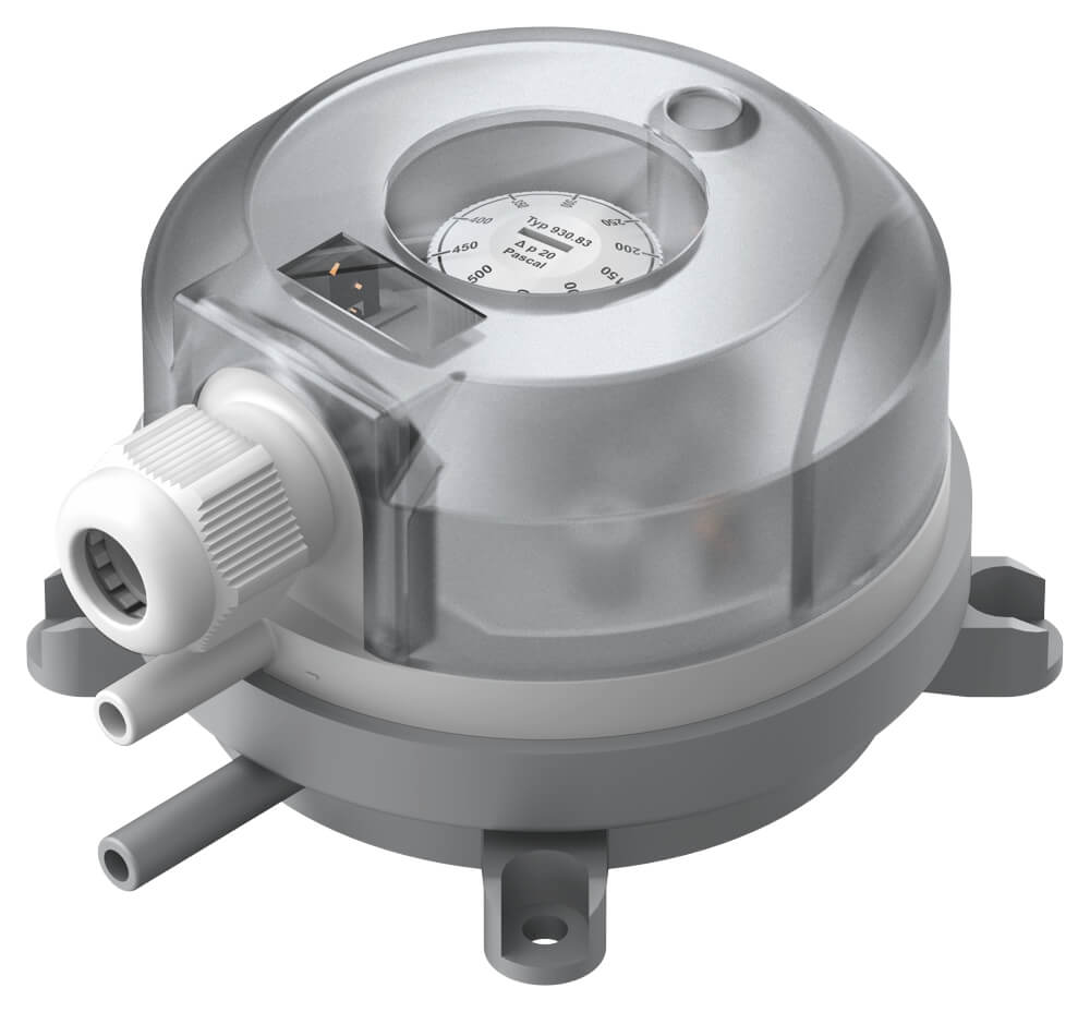 开关压力可以通过一个带刻度的调节旋钮进行调节,而无需压力表。为此,可提供各种调节范围在 0.2 毫巴至 50 毫巴之间的重叠版本。作为标准配置,压力开关配有防护等级为 IP54 的透明盖。