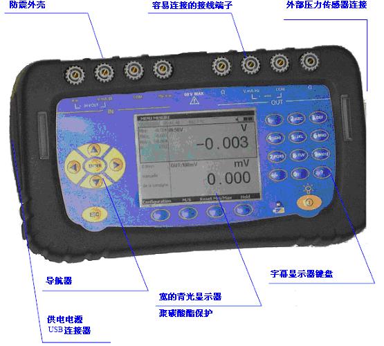 该仪器可测量和生成电压、电流、频率、电阻信号、电阻探头和热电偶。当与可选的外接压力模块一起使用时还可以测量压力。