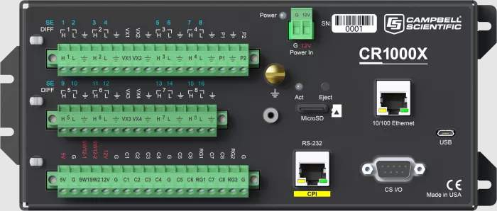 CR1000X是一款低功率的设备,用于传感器测量、直接/远程通讯连接、数据分析、外部设备控制、数据和程序的存储,采用密封装置屏蔽射频干扰,金属不锈钢外壳。精密时钟,支持Campbell Scientific 数据采集器通用的类BASIC编程语言—具备数据处理和分析功能。CR1000X 接线面板上有两个开关12 V 端子, 16 个模拟测量端子,端子可拆卸。