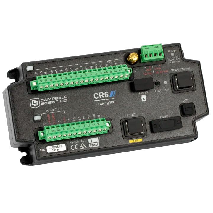 CR6 具有多种端子类型,可与几乎所有可用的传感器兼容,包括模拟(电压和电流)、热电偶、串行、SDI-12、振动线、脉冲和频率传感器。