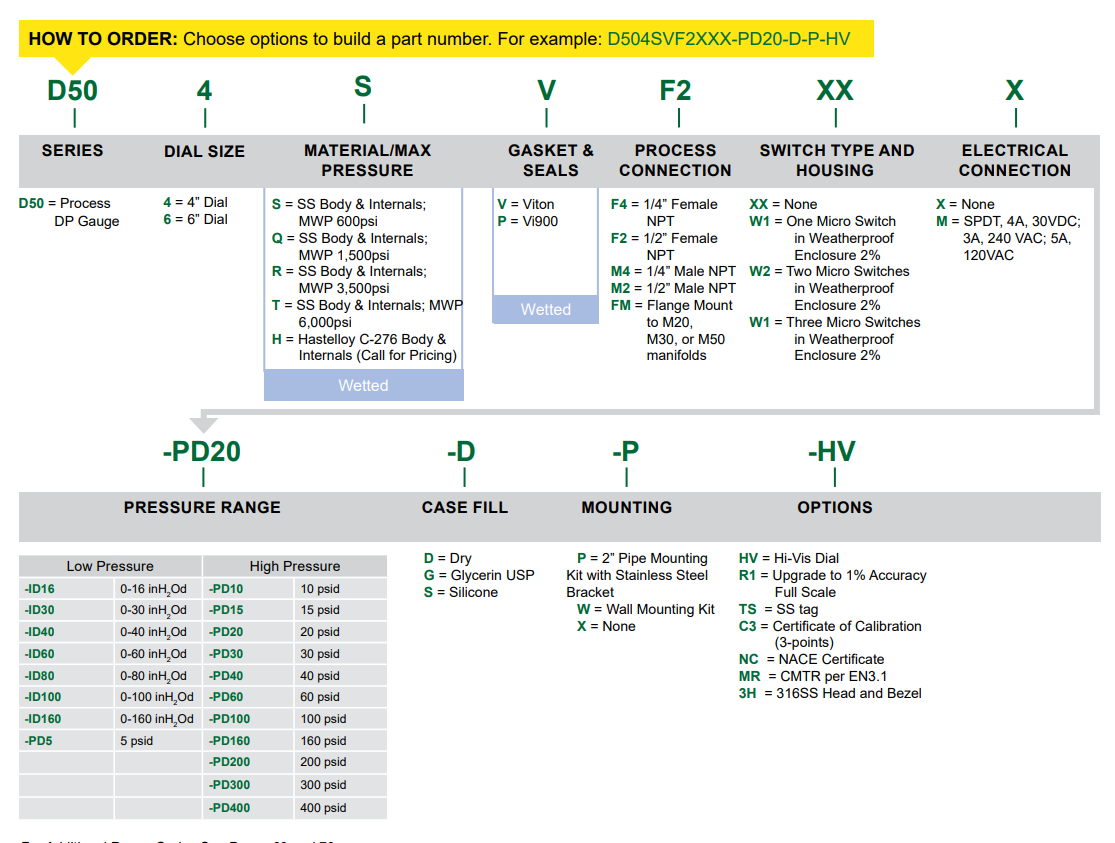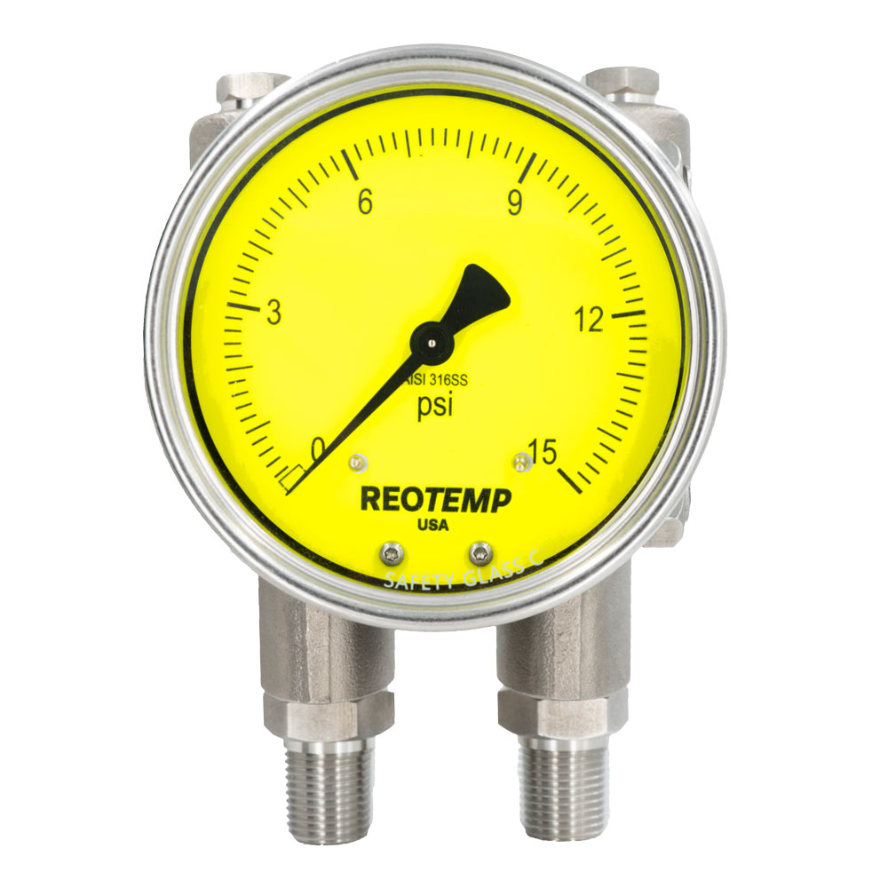 Reotemp D50 系列压差计广泛应用于加工工业中需要坚固耐用的全不锈钢结构的异种液体和气体。这款高精度压差表具有大刻度盘面、270° 全弧度和可选的 Hi-Vis™ 高透视刻度盘,可在多种不同的照明条件下轻松读取数据。高、低压外壳具有冲洗压力腔内积聚的固体颗粒的功能。压力腔内装有耐腐蚀的隔膜,隔膜内充满液体以补偿静压。外部机身和工艺端口的尺寸与大多数现场安装型差压变送器相同,便于安装到歧管上。