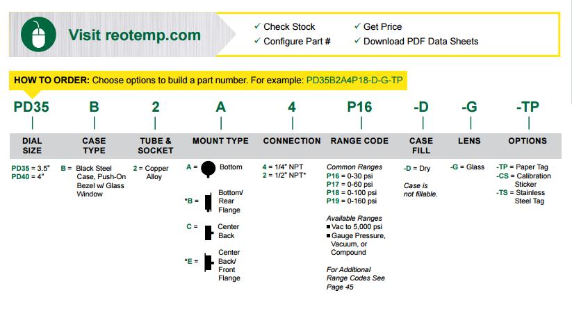 REOTEMP的PD35 / 40系列提供各种经济型压力表,适用于无需考虑环境或过程腐蚀的应用。PD35 / 40系列适用于非振动应用。