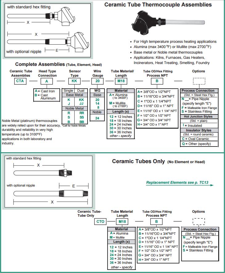 REOTEMP陶瓷保护管热电偶专为高温应用设计,提供贵金属和贱金属两种热电偶类型。贵金属热电偶因其在极端高温(高达3100°F)应用中的高精度、耐用性和可靠性而被广泛采用。陶瓷管式热电偶常用于窑炉、熔炉、燃气加热器及焚烧炉等设备,广泛应用于热处理、冶炼和铸造等工艺流程。