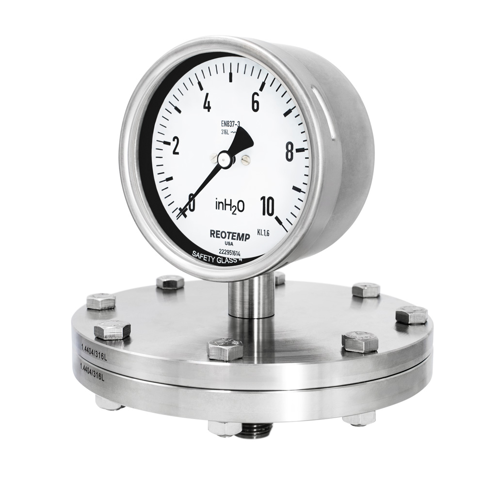 Reotemp 的 PSS 系列是 Schaeffer 式密封压力表,带有隔膜传感元件,用于测量气体、液体或固体的压力。机械隔膜密封设计最大程度地减少了与热有关的精度误差,是低压应用的理想选择。